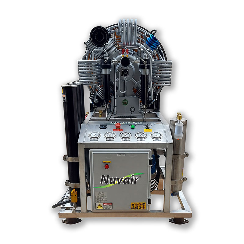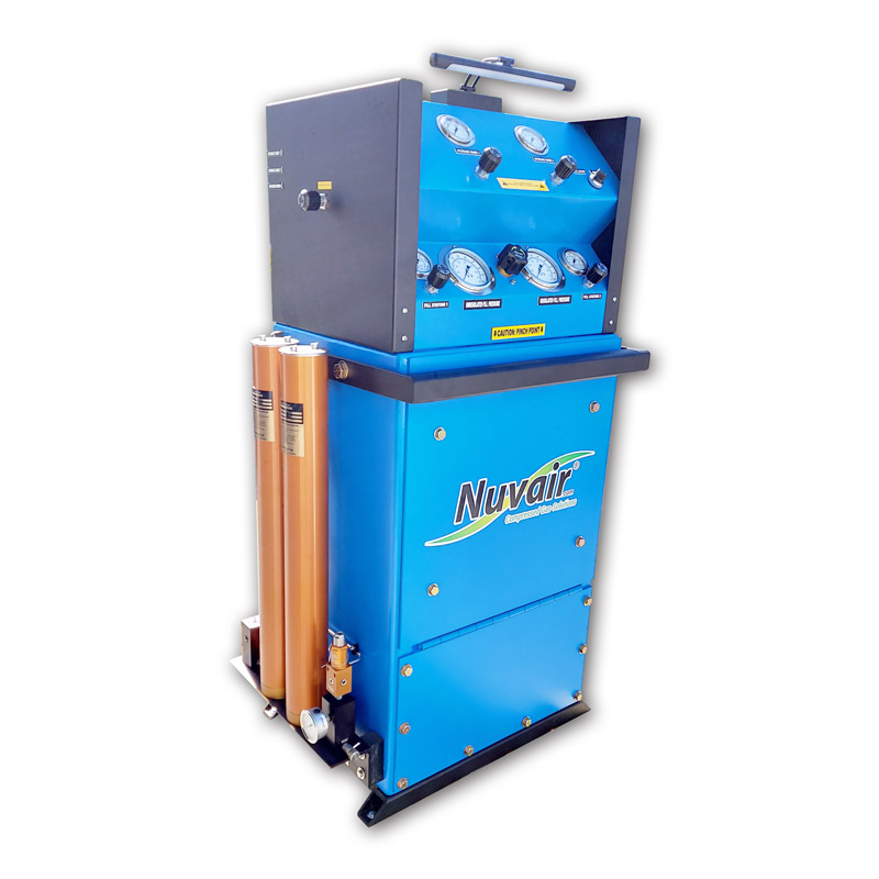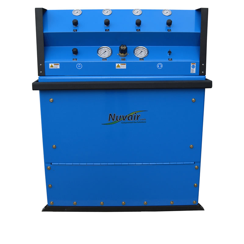 Nuvair supplies fire stations, rescue organizations and safety facilities with high pressure breathing air compressors, gas analyzers and SCBA/SCUBA fill containment stations. Nuvair portable and stationary breathing air compressors deliver 3-26 CFM (84-736 L/min). Commonly referred to as "blast cabinets" and "fragmentation containers, " our one- to four-cylinder SCBA/SCUBA fill containment stations come with manual or pneumatic door controls and digital gas analyzers. If our stock equipment do not meet your needs, a custom-built solution will meet your agency's specifications.