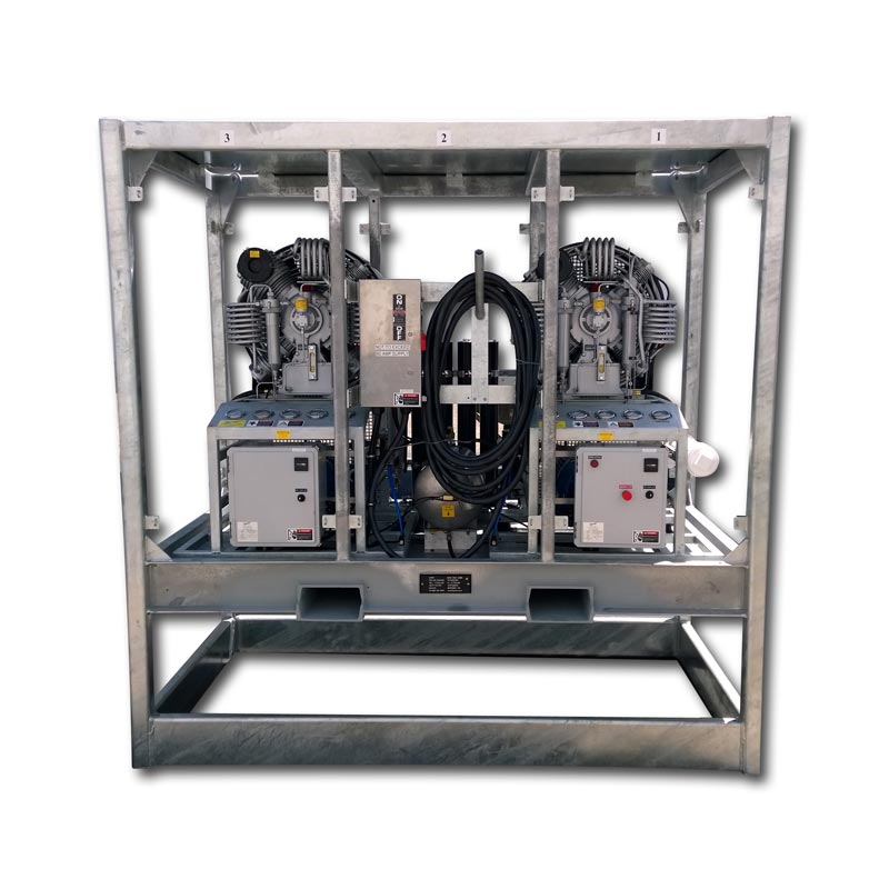 Below, left is an example of a custom-built Hydrovane compressor for a large dental office. Below, right is an example of a custom low-pressure 500 psi (34 bar), back-up compressor we built for the offshore gas and oil industry.